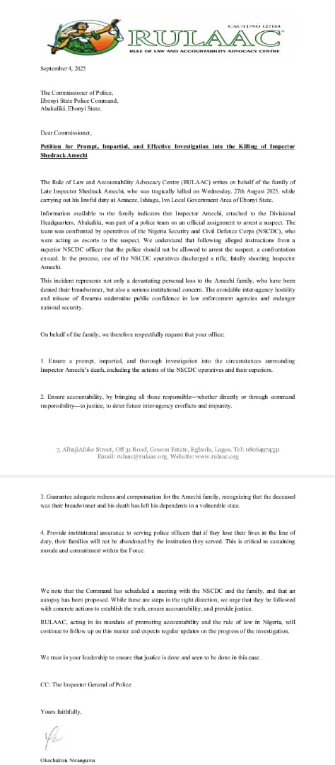 The petition read; “The Rule of Law and Accountability Advocacy Centre (RULAAC) writes on behalf of the family of Late Inspector Shedrack Amechi, who was tragically killed on Wednesday, 27th August 2025, while carrying out his lawful duty at Amaeze, Ishiagu, Ivo Local Government Area of Ebonyi State.