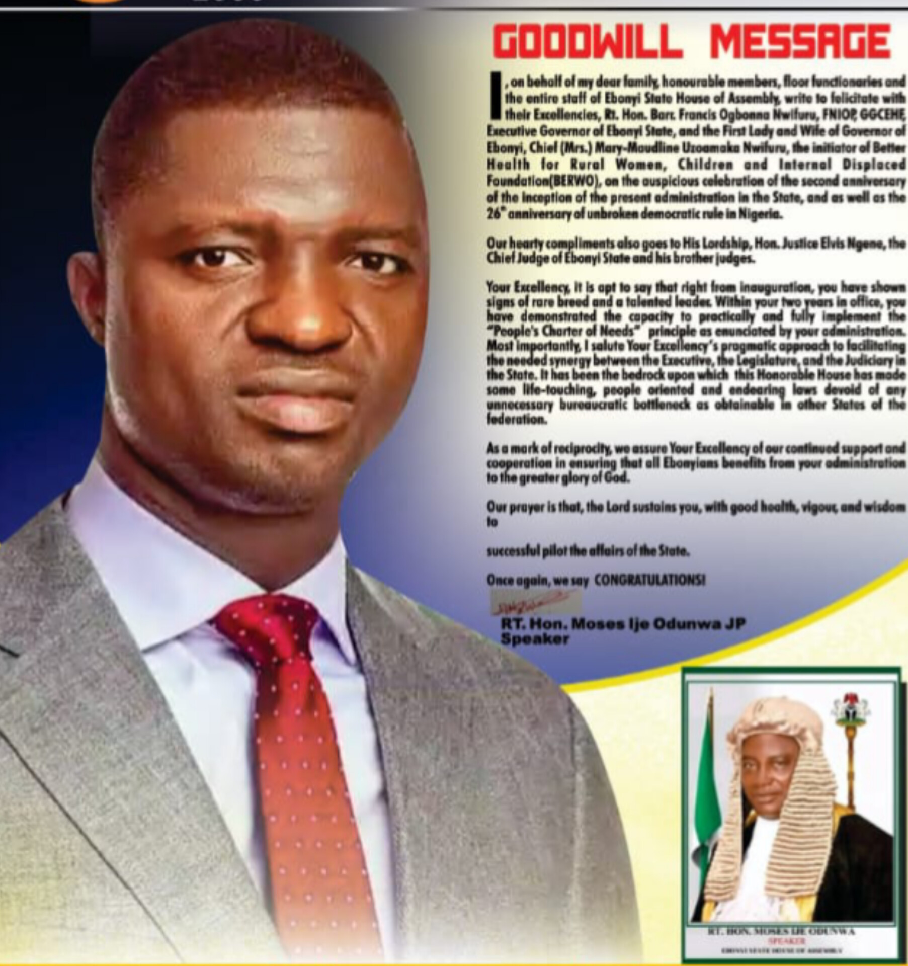 In a goodwill message marking the Governor’s second anniversary in office, Speaker Odunwa, who represents Ikwo South Constituency, praised the governor for his uncommon leadership style, which he described as practical, inclusive, and results-driven.