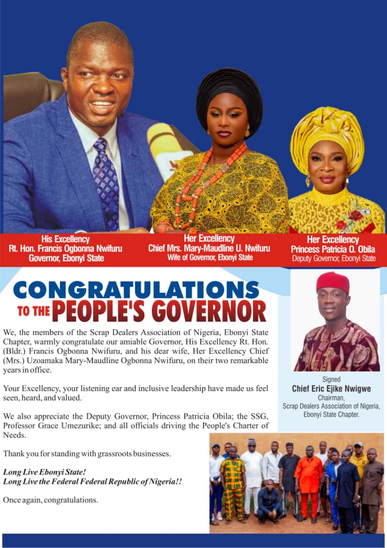 The Scrap Dealers Association of Nigeria, Ebonyi State Chapter, has extended warm congratulations to the Executive Governor of Ebonyi State, His Excellency Rt. Hon. (Bldr.) Francis Ogbonna Nwifuru, and his wife, Her Excellency Chief (Mrs.) Uzoamaka Mary-Maudline Ogbonna Nwifuru, on the celebration of their two years in office.